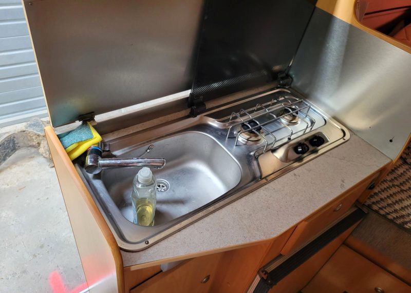 Cuisine équipée avec réchaud, évier et rangements